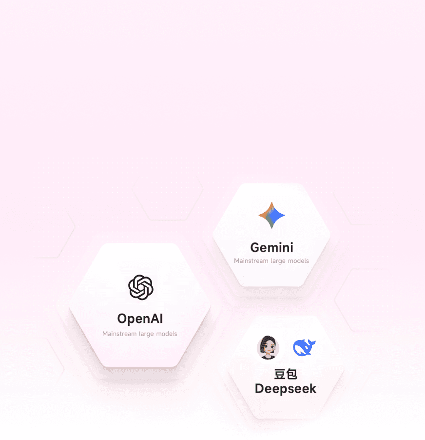 调用 OpenAI、Gemini、豆包、Deepseek、Sora、即梦等前沿主流大模型,支持文本、图像、音视频全类型生成,适配多元出海需求,模型持续迭代升级。
