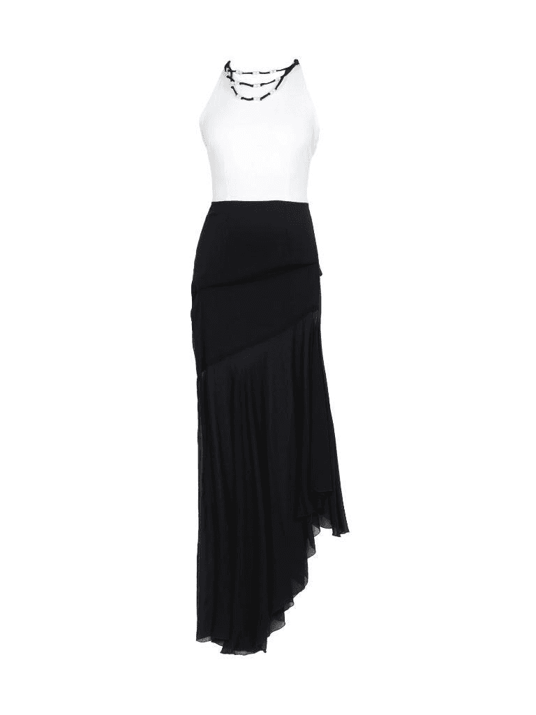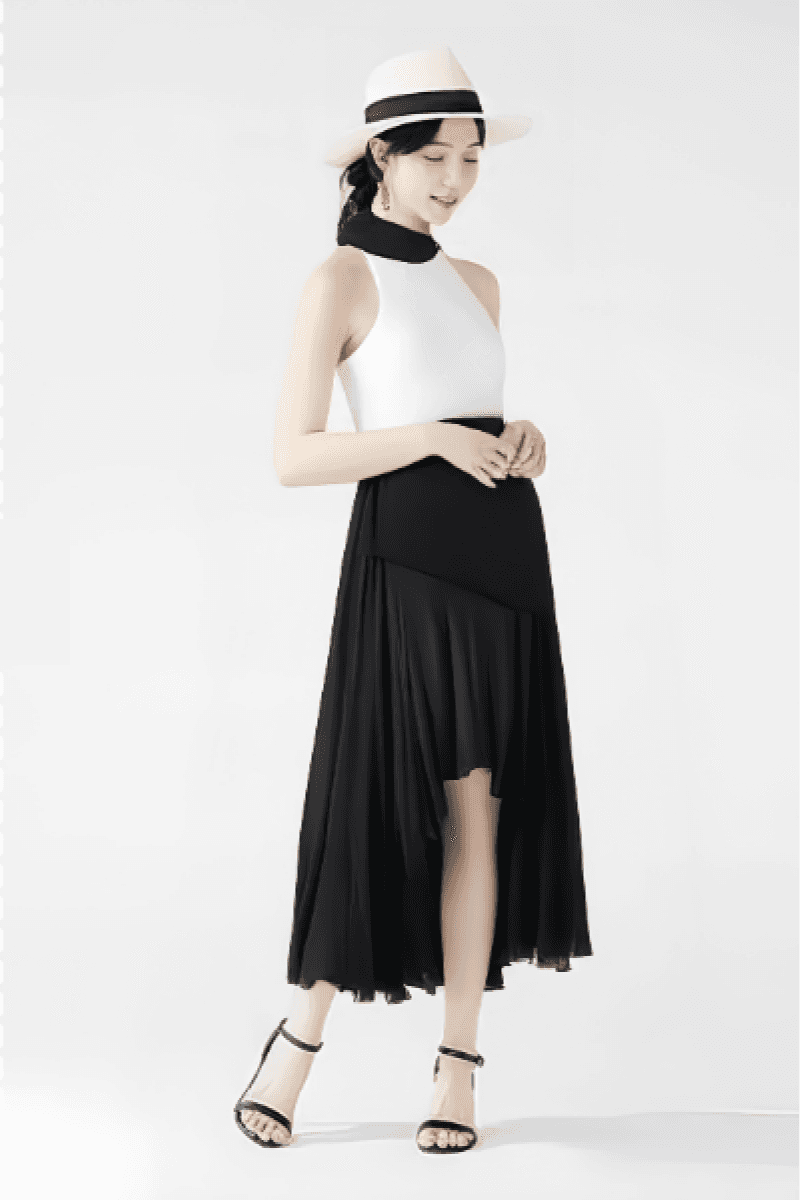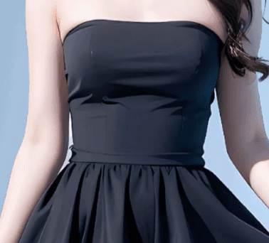 服饰:身着一件黑色抹胸收腰连衣裙,裙身简约高级,露出纤细的肩颈线条。